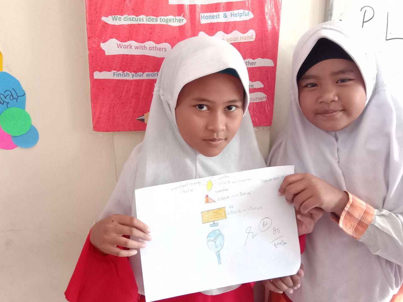 Di akhir pembelajaran, guru mencoba keberanian mereka dengan berkampanye menyeru gerakan hemat energi dengan poster yang sudah mereka buat di depan kelas.